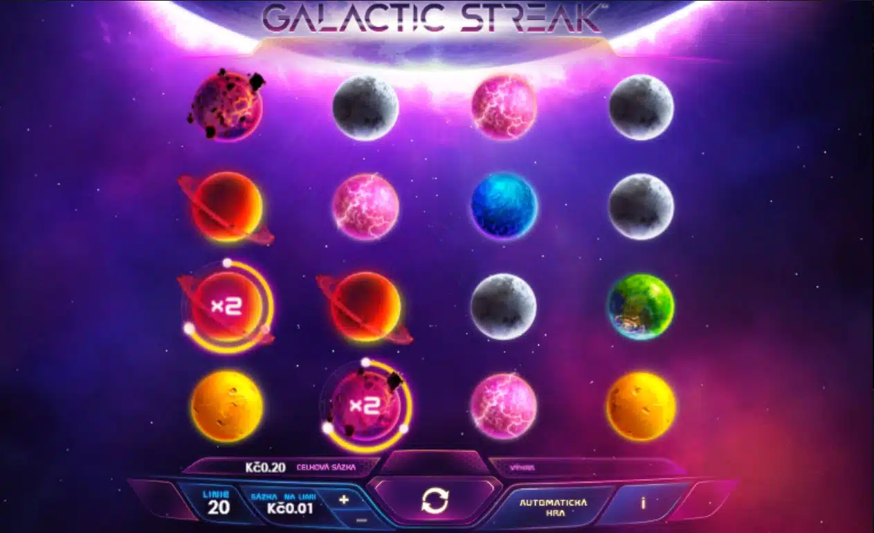 Online automat Galactic Streak od známého výrobce Playtech se odehrává ve vesmíru a má futuristický design a grafiku. Jde o herní automat s pěti válci a různými výherními liniemi. Máš možnost vsadit různé částky a otáčet válci, abys dosáhl výher. Hra obsahuje různé vesmírné symboly, které ti mohou přinést výhry. Mezi nimi mohou být například různé planety, hvězdy a další vesmírné objekty. „Galactic Streak“ může obsahovat různé bonusové funkce, jako jsou například bezplatné točení, násobitele výher a další bonusové hry.