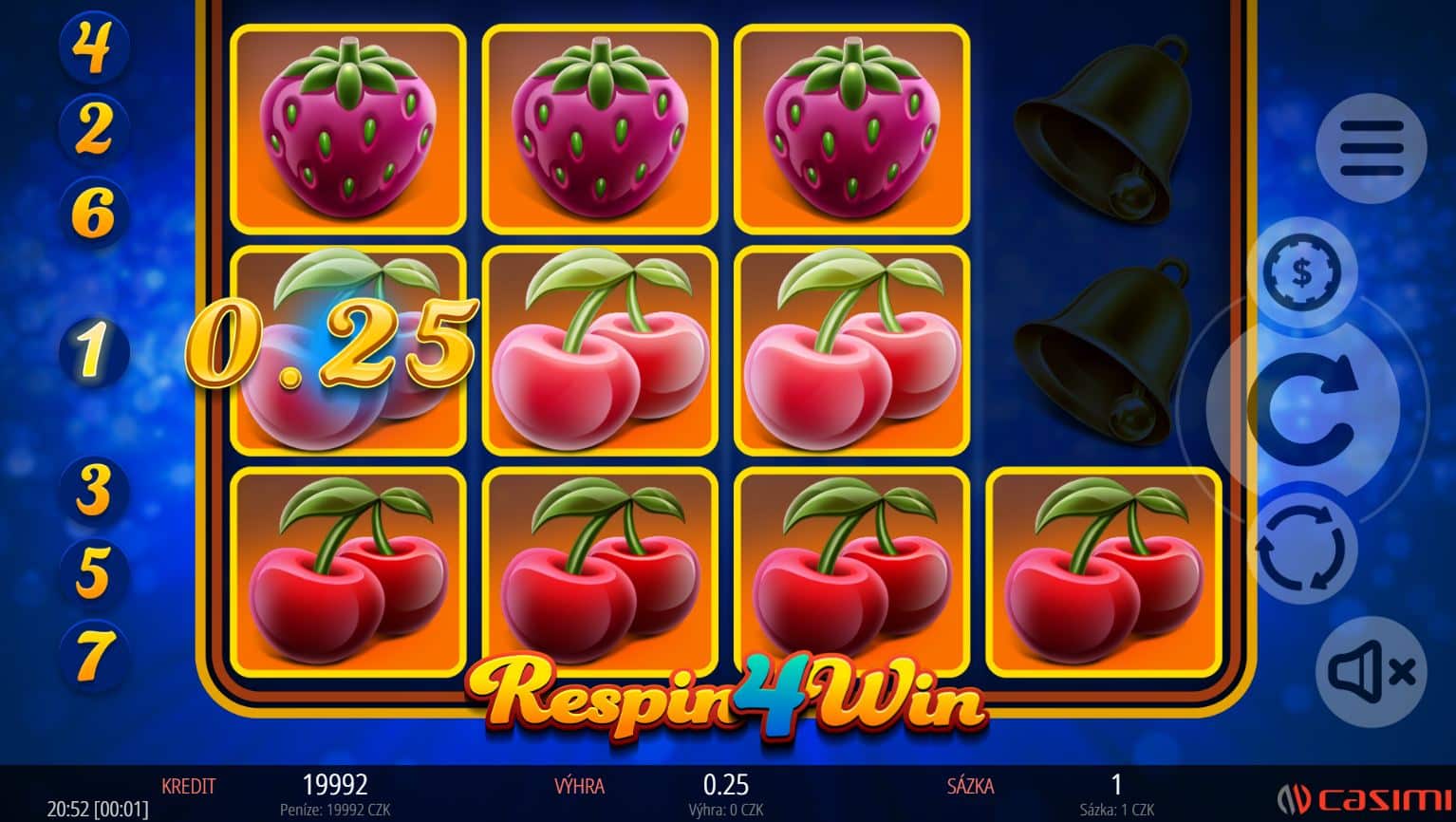 Online herní automat Respin 4 Win je plnohodnotným nástupcem herního slotu Respin 3 Win. Vývojáři z Casimi zachovali jednoduchou, ale poměrně poutavou hratelnost. Na první pohled se hra může zdát jako obyčejný slot, ale jakmile se začnou roztáčet válce, rychle pochopíš, proč si hra získala tak velkou oblibu. Respin 4 Win je slot se čtyřmi válci a fixně danými výherními liniemi. Konkrétně jich je 7, není to mnoho, ale i tak se s nimi dá mnohé vykouzlit!