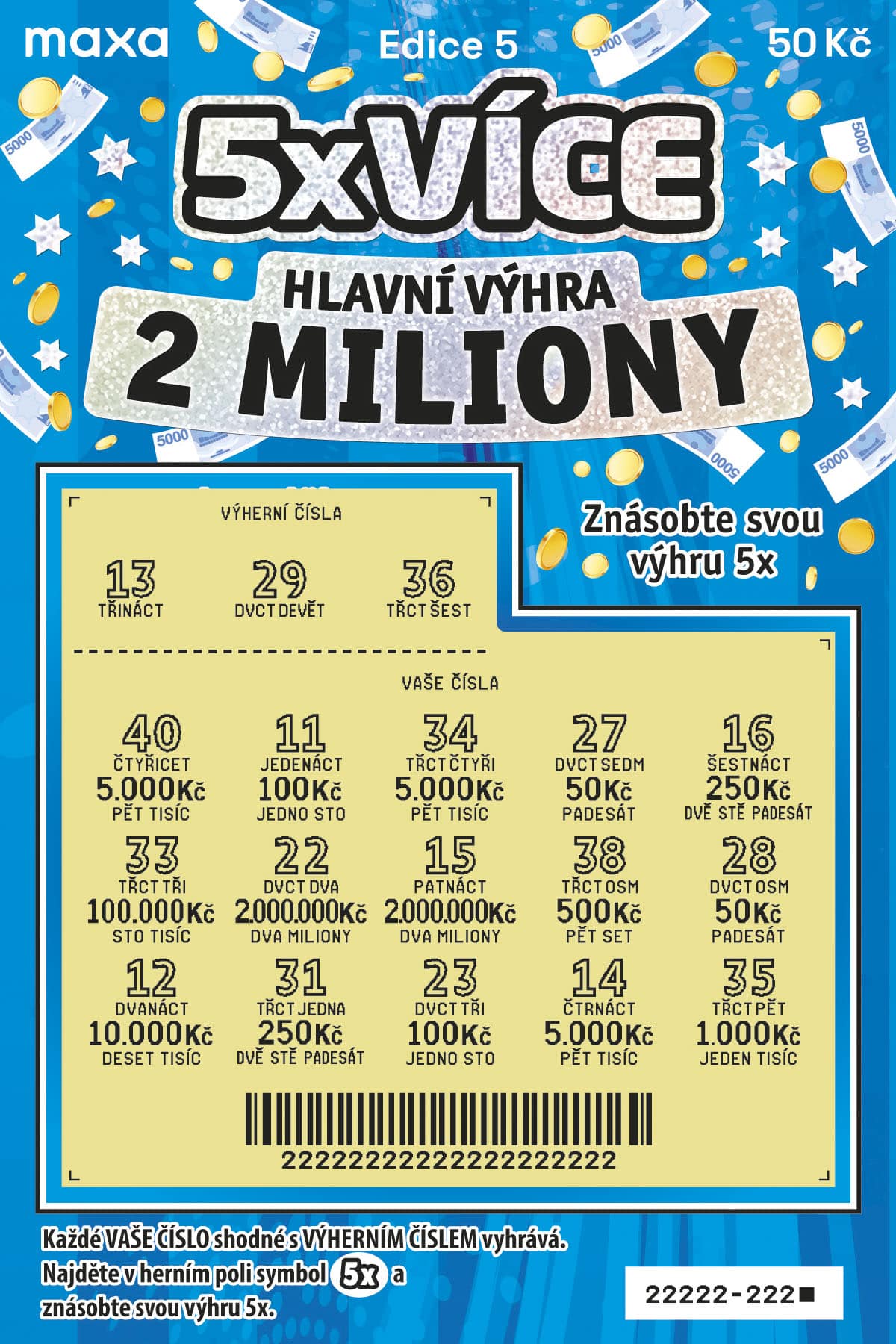 Stírací los 5x Více od Maxy. Hlavní výhra 2 miliony a políčko na pětinásobek. Vyzkoušej své štěstí a odnes si parádní výhru! Více