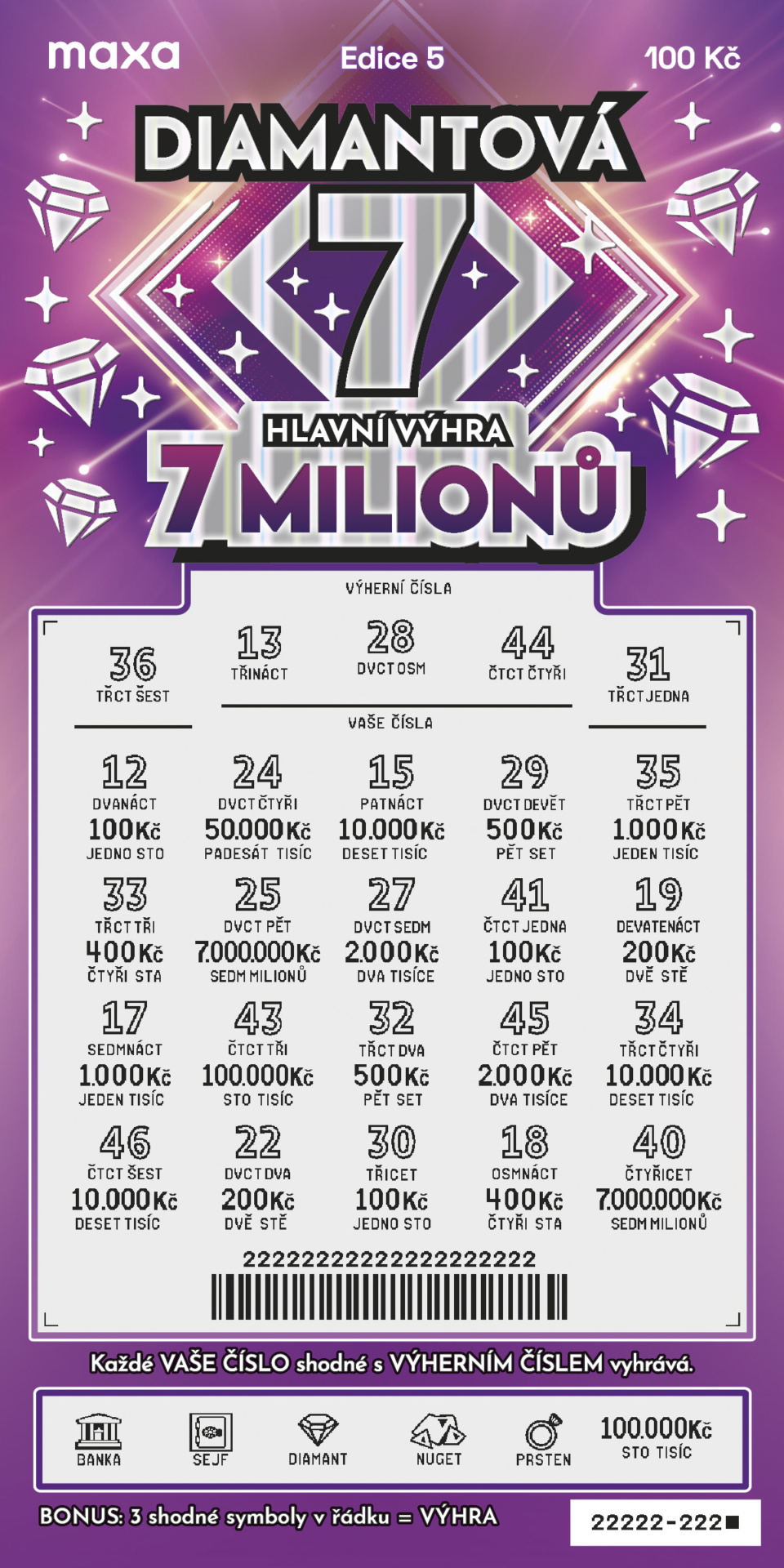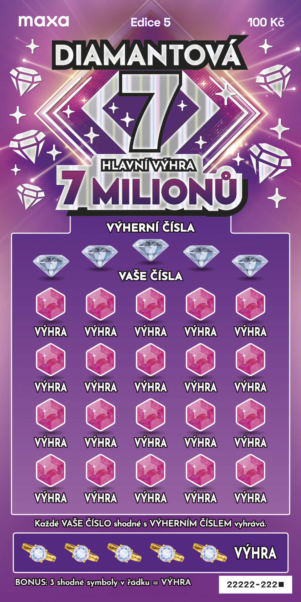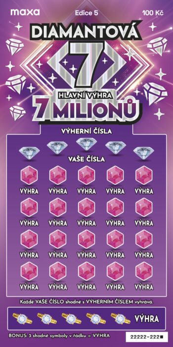 Stírací los Diamantová 7 od Maxy. Za 100 korun se toho dá vyhrát opravdu hodně. Třeba hlavní výhra 7 milionů, poukaz na diamanty nebo výhra na bonusovém poli. Více
