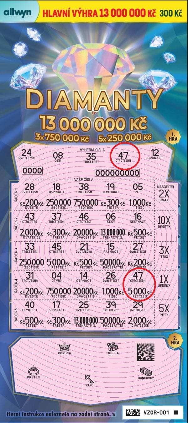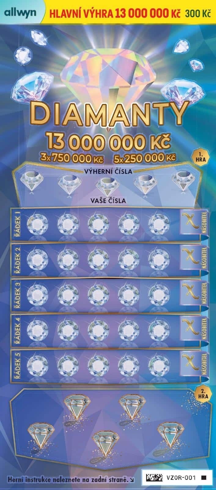 Objev svět luxusu s losem Diamanty od Sazky a zahraj si ve velkém. Za 300 Kč vstoupíš do hry plné třpytu a můžeš si sáhnout až na hlavní výhru 13 000 000 Kč. Stačí odhalit správné symboly a třeba právě tobě se rozsvítí diamantová výhra, která ti změní život. Více