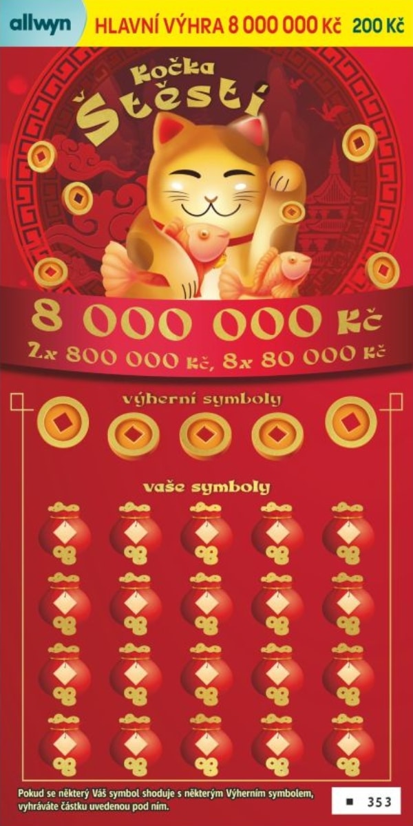Stírací los Kočka štěstí od Sazky za 200 Kč slibuje pořádnou dávku napětí – a také šanci ulovit hlavní výhru 1 000 000 Kč. Tahle kočka nepřede jen tak pro radost: když vám skočí do cesty, může vám svými tlapkami přistrčit pořádný balík štěstí. Více