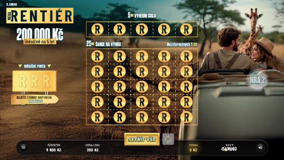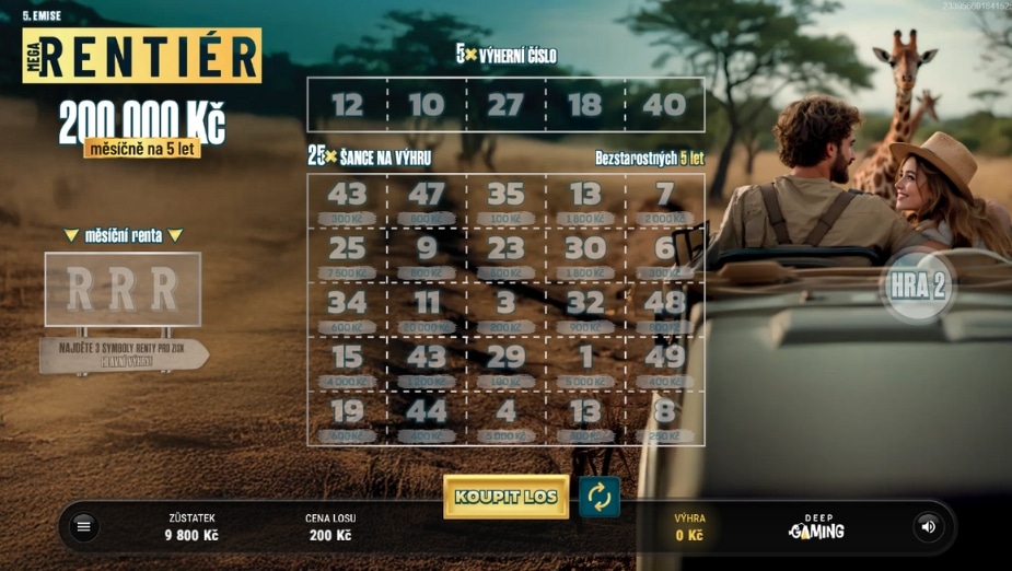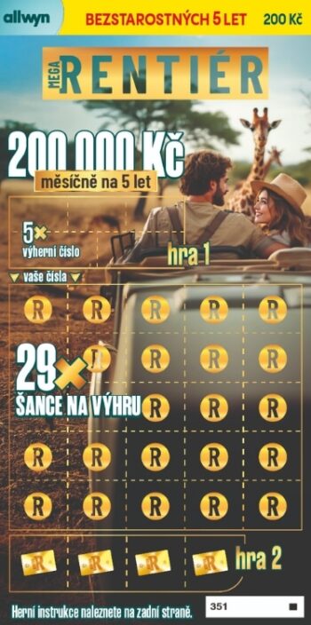 Pokud v poli měsíční renta odkryješ tři symboly renty, automaticky vyhráváš hlavní cenu ve výši 200 Kč měsíčně na 5 let.
