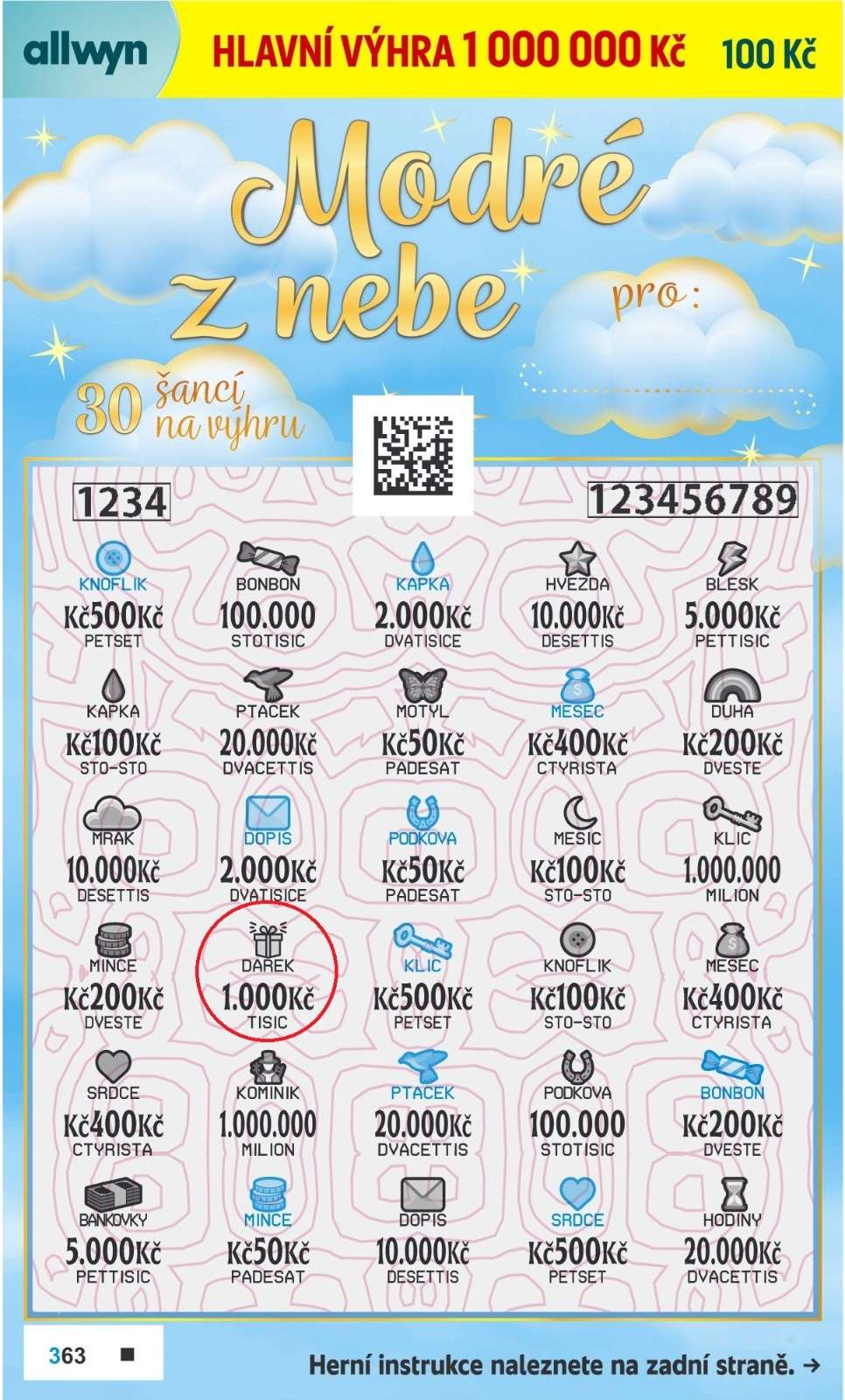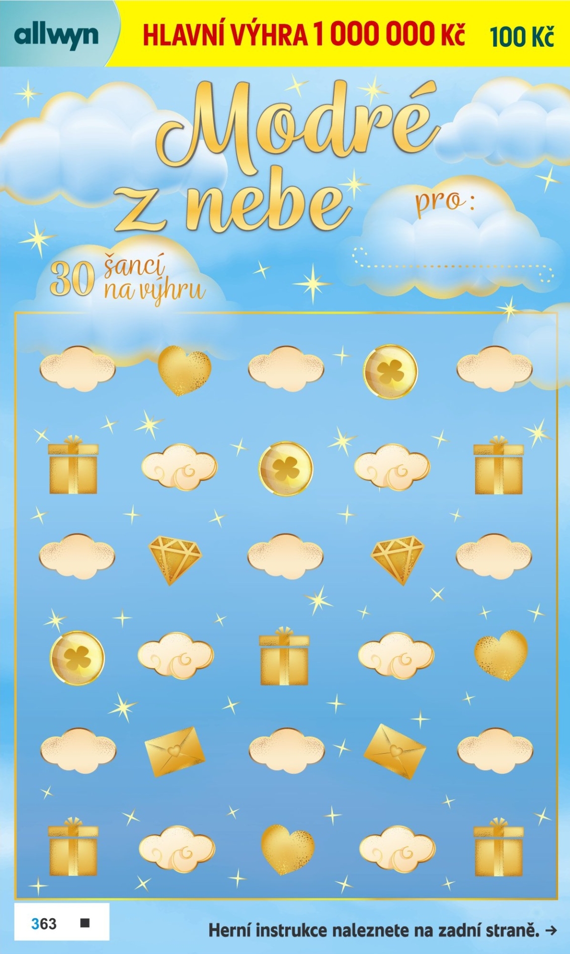 Zažij pocit, jako když ti štěstí spadne přímo z nebe. S losem Modré z nebe od Sazky si za 100 Kč můžeš zahrát o hlavní výhru 1 000 000 Kč. Stačí odkrýt pole a sledovat, jestli se právě na tebe neusměje nebeská výhra. Více