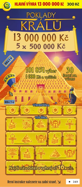 Vydej se po stopách faraonů s losem Poklady králů za 200 Kč a odhal tajemství sfingy, která střeží hlavní poklad. Čeká na tebe královská výhra až 13 milionů korun – troufneš si ji získat? Více