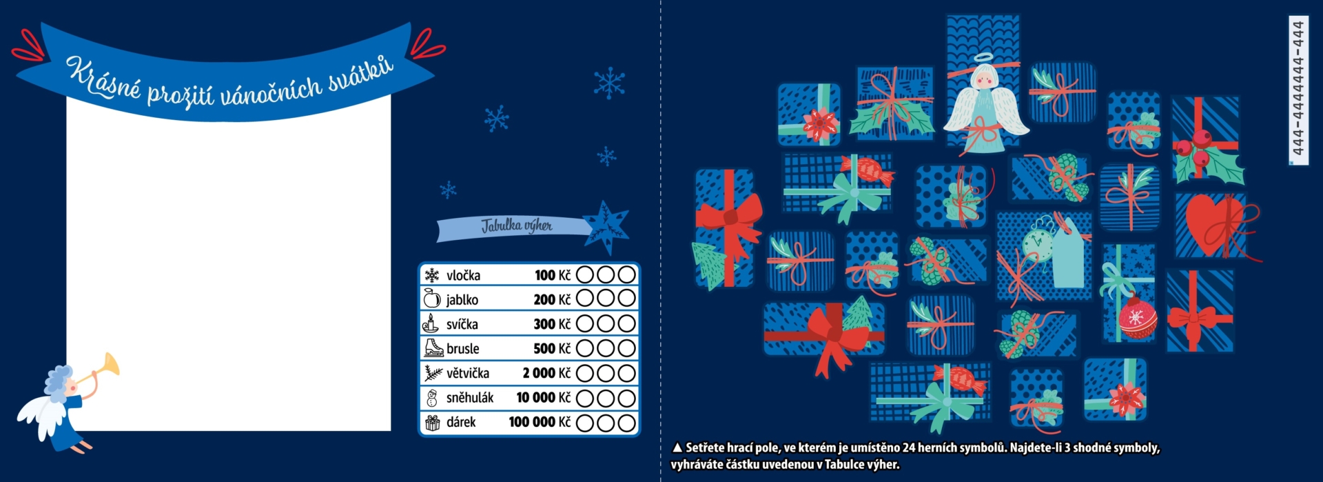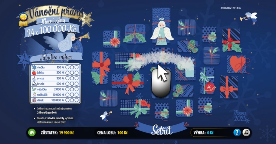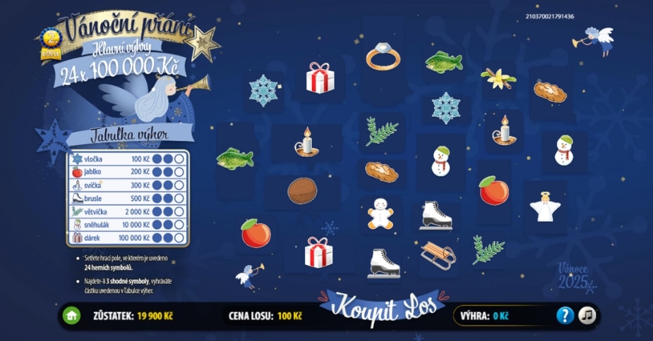 Stírací los Vánoční přání od Sazky. Vánočně laděný los s hlavní výhrou 100 tisíc korun. Dejte si ho třeba pod talíř pro štěstí a koukejte jak vám plní Vánoční přání. Více