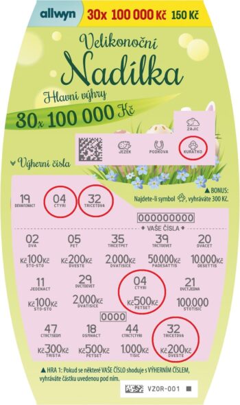 Setři všechna výherní i vaše čísla. Pokud se některé z tvých čísel shoduje s některým z výherních, vyhráváš částku uvedenou pod tvým číslem.