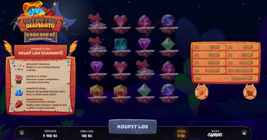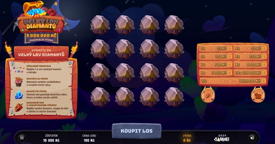 Setři celé hrací pole a odkryj 16 kamenů. Pod nimi se skrývají drahokamy nebo obyčejné kamení. Najdi alespoň 3 stejné drahokamy a vyhraj částku podle jejich počtu – čím víc jich najdeš, tím větší výhra (od 25 Kč až po 1 000 000 Kč). Pokud najdeš symbol vozíku s drahokamy, znásobíš svou výhru až 10× podle čísla na vozíku. Pokud odkryješ symbol diamantu, otevři truhlu a získej okamžitou výhru uvedenou pod ní. A pokud objevíš symbol dynamitu, spustíš BONUSOVOU HRU.