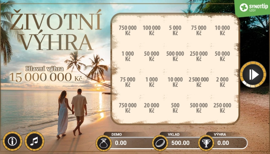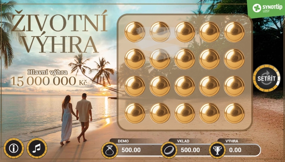 Stírací los Životní výhra od Synottipu ti dává šanci změnit svůj život jedním setřením – hraje se o fantastických 15 000 000 Kč. Za 500 Kč můžeš vstoupit do hry o skutečně velkou výhru, která ti může splnit sny, na které jsi dosud jen myslel. Více