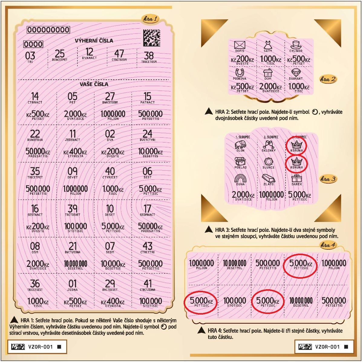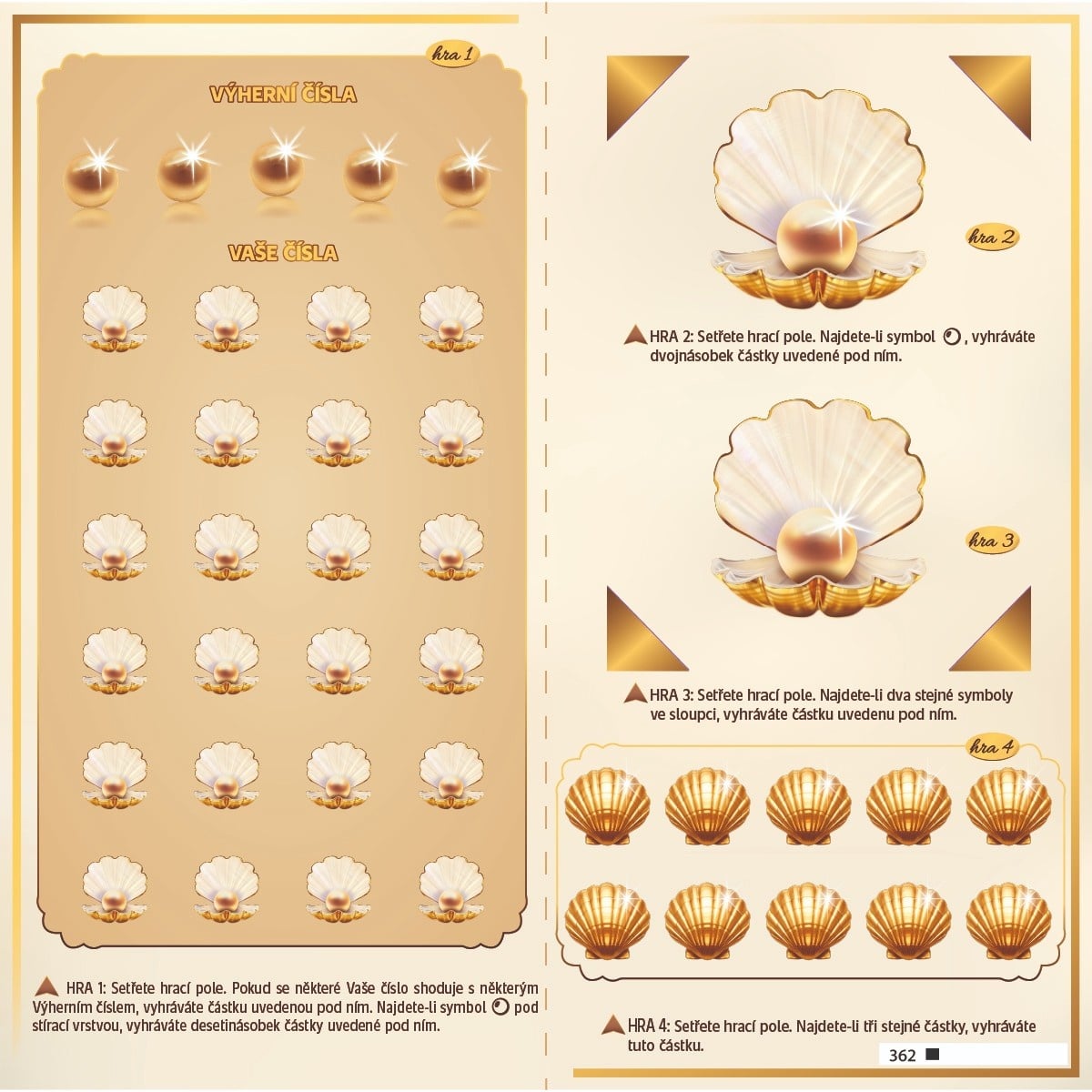V této hře najdeš výherní čísla a tvoje čísla. Pokud se některé tvé číslo shoduje s některým výherním, vyhráváš částku uvedenou pod ním. Pokud objevíš symbol perly, automaticky získáš desetinásobek částky, která je uvedená pod ní.